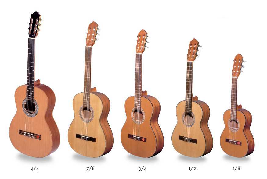 Классическая гитара представлена разными размерами: 4/4, 3/4, 1/2, а также 1/4. Можно выбрать инструмент, подходящий конкретному исполнителю, исходя из его возраста, телосложения, а также удобства использования.