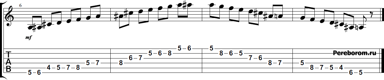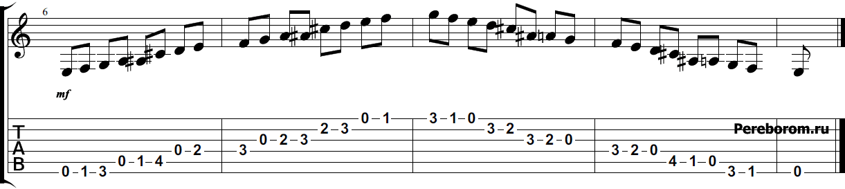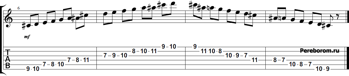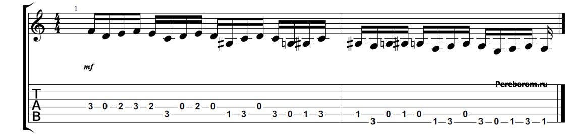 Похожее на предыдущее упражнение, разница лишь в том, что тут задействованы все струны, а также гамма восходящая, а не нисходящая. Кроме этого, в некоторых местах вам потребуется использовать прием легато для того, чтобы переход между нотами был плавным.