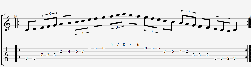Ниже представлены несколько упражнений для отработки гаммы до-мажор. Вместе с подробным описанием также идут табы и аудиодорожки, где можно будет более подробно их разобрать. Кроме того, все эти упражнения можно перенести и на другие тональности без каких-либо проблем.