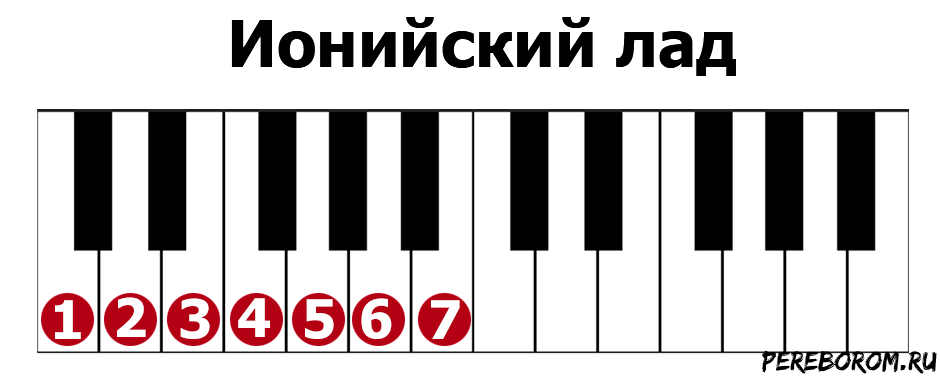 Ионийский лад – это стандартная мажорная гамма, от которой в дальнейшем вы научитесь достраивать другие народные лады. Он обладает торжественным, радостным оттенком звучания, и отлично подойдет для гимнов или позитивных песен. Некоторые называют его наивным и детским, мечтательным. Именно этот лад стоит научиться выстраивать в первую очередь, потому что, поняв принцип его построения, в дальнейшем вы сможете гораздо проще вникать в специфику других ладов.