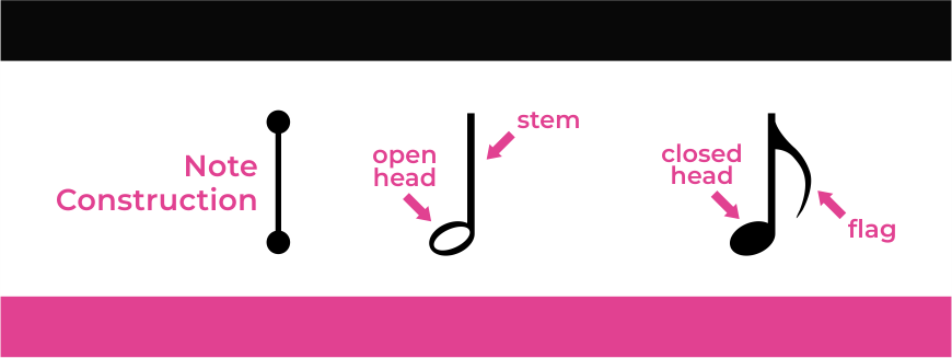 Ноты состоят из трех основных элементов, включая головку, ножку и флажок(и).
