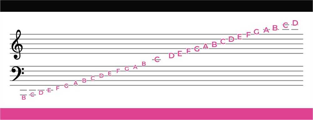 Однако мы помним, что музыкальные звуки охватывают намного больший диапазон, чем малая и первая октавы. Поэтому, чтобы получить полное представление о расположении нот на нотном стане, вам нужно изучить более подробную схему размещения нот: