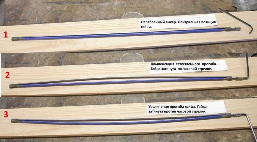 Анкер – это длинный металлический стержень, находящийся внутри грифа, который регулирует его прогиб.и препятствует деформации под натяжением струн. Чаще всего он отстроен хорошо и трогать не нужно, но если гитара дребезжит при средней силе игры, то придется повозиться.