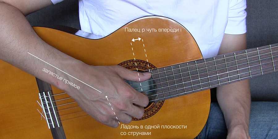 При игре перебором пальцы все пальцы должны быть в полусогнутом состоянии и быть перпендикулярны большому — образовывать своеобразный крест.