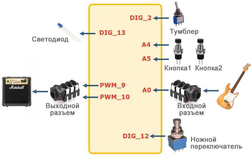 Ниже показана связь интерфейсов гитарной педали (вход/выход, элементы управления) с выводами платы Arduino Uno.