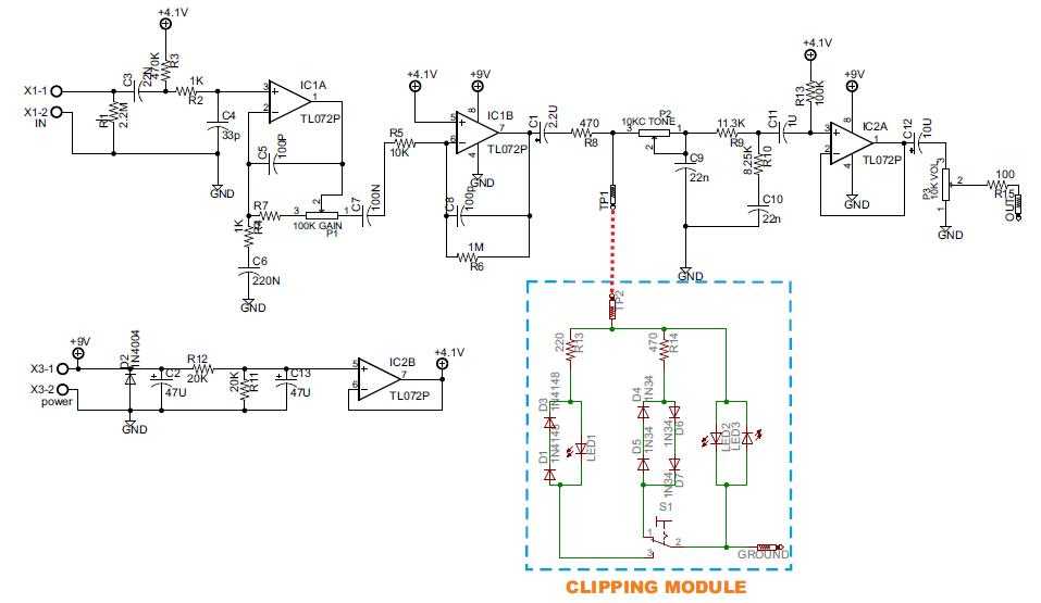 Здесь требуется трехпозиционный тумблер ON-ON-ON с 6-ю контактами, который я не нашел у нас в городе, поэтому делал чуть упрощенную версию, но, судя по всему, не совсем корректную в плане переключения режимов. Эта схемка отличается только в нижним каскадом с тумблером (так называемый clipping module).