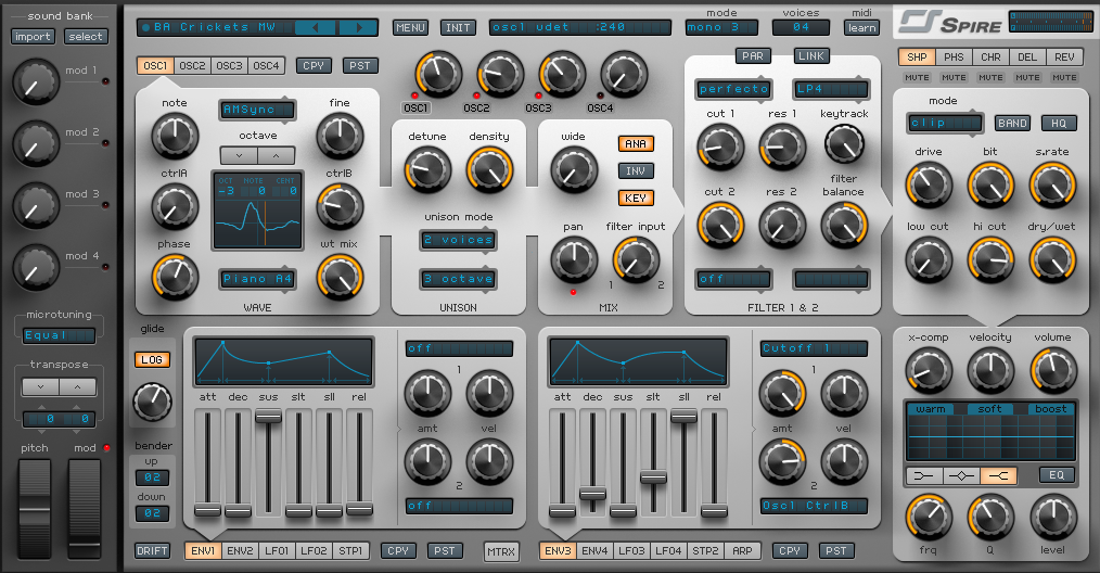 Большую часть славы для Spire завоевала его секция Unison и особенно удивительный обширный и всепоглощающий унисон в звуке, что и цениться в фестивальной музыке. И достичь этого может любой начинающий, всего несколькими движениями ручек САМ, не прибегая не к каким пресетам в данном VST!