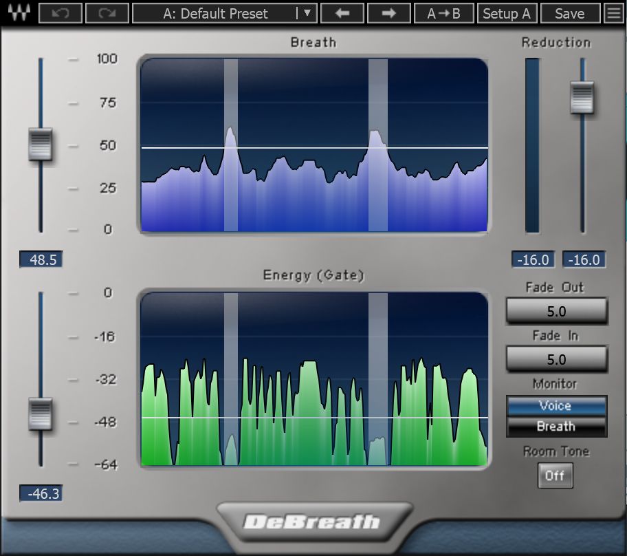 - Energy измеряет громкость голоса. Если энергия голоса ниже порога срабатывания, вероятнее всего, мы имеем дело со вдохом.Если значение Breath выше порога и значение Energy ниже порога, плагин считает что этот фрагмент — вдох, и понижает громкость на значение Reduction.