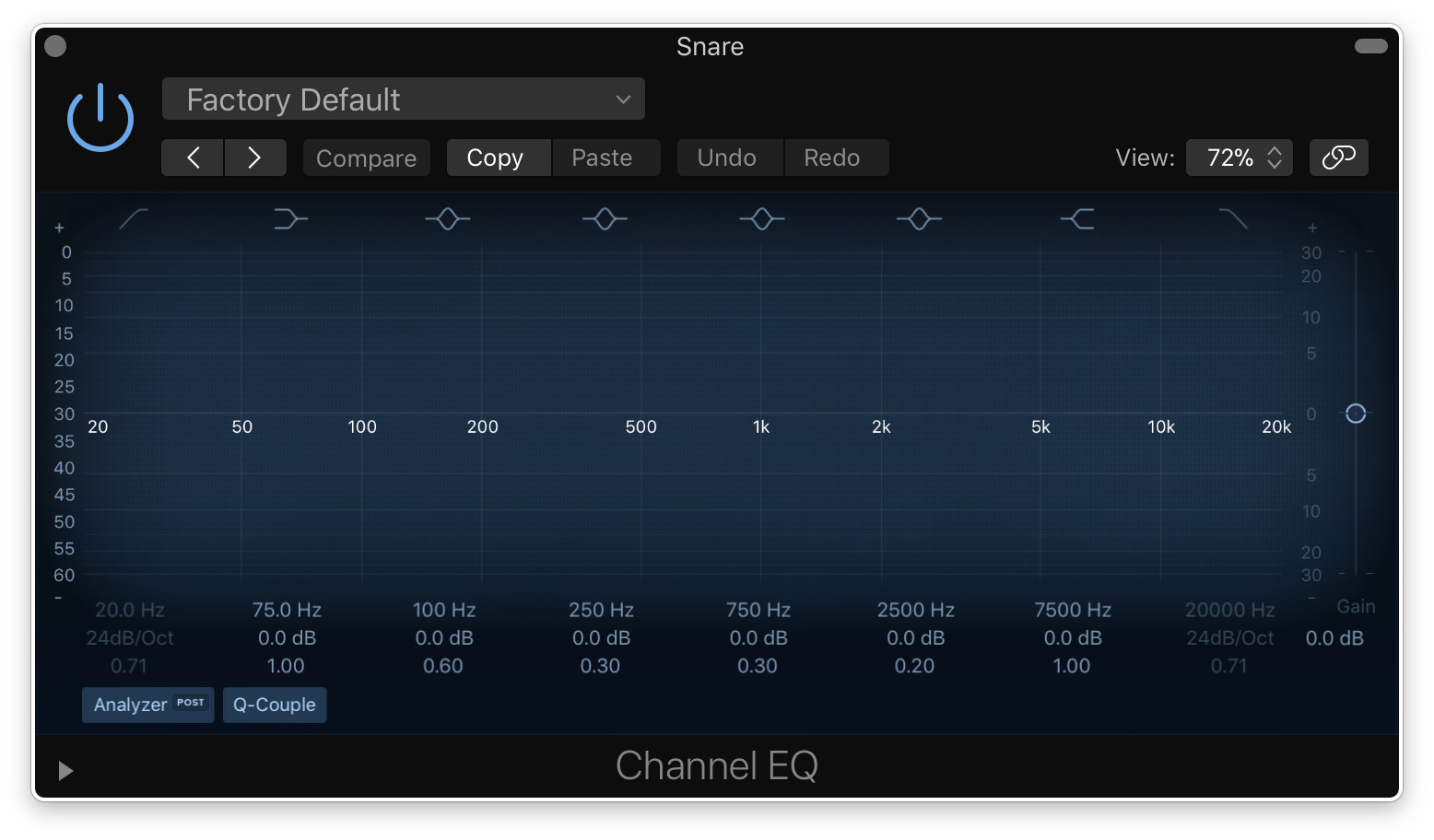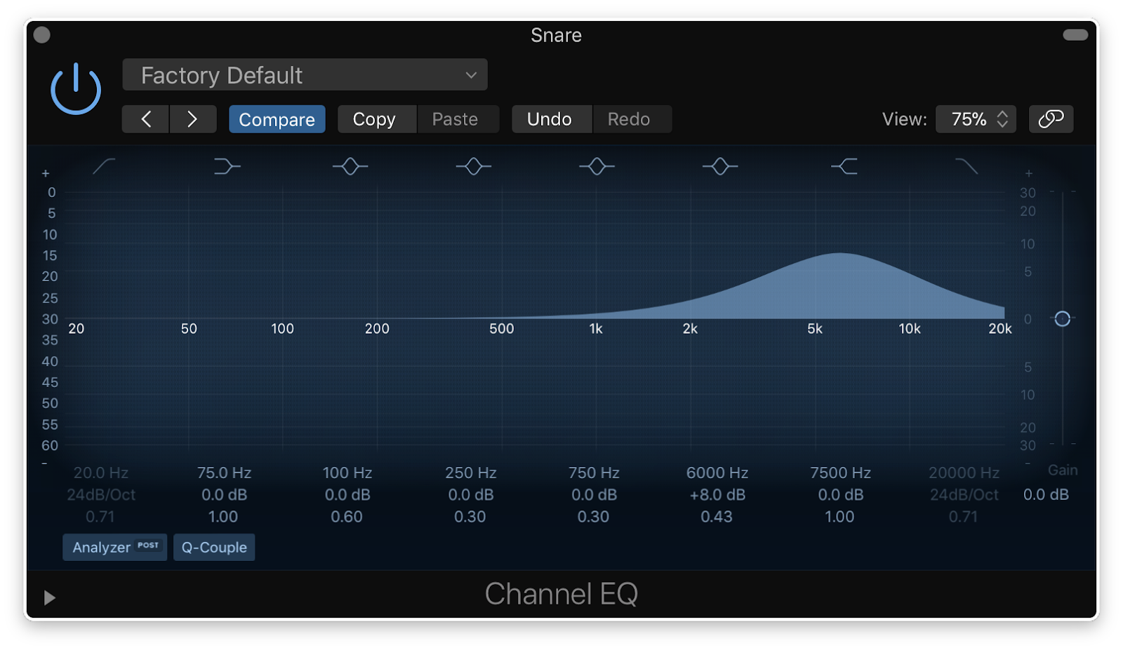 Скажем, вы хотите добавить “треска” снейру. Чтобы это сделать, вам, возможно, понадобится довольно сильный подъем высоких частот.