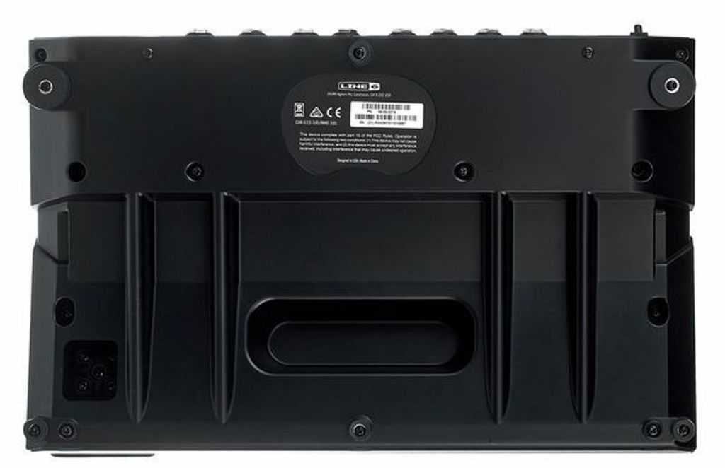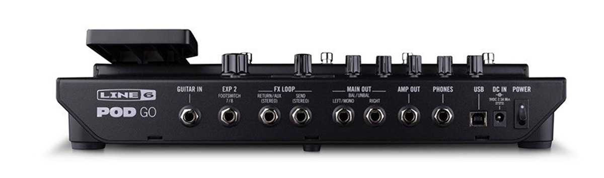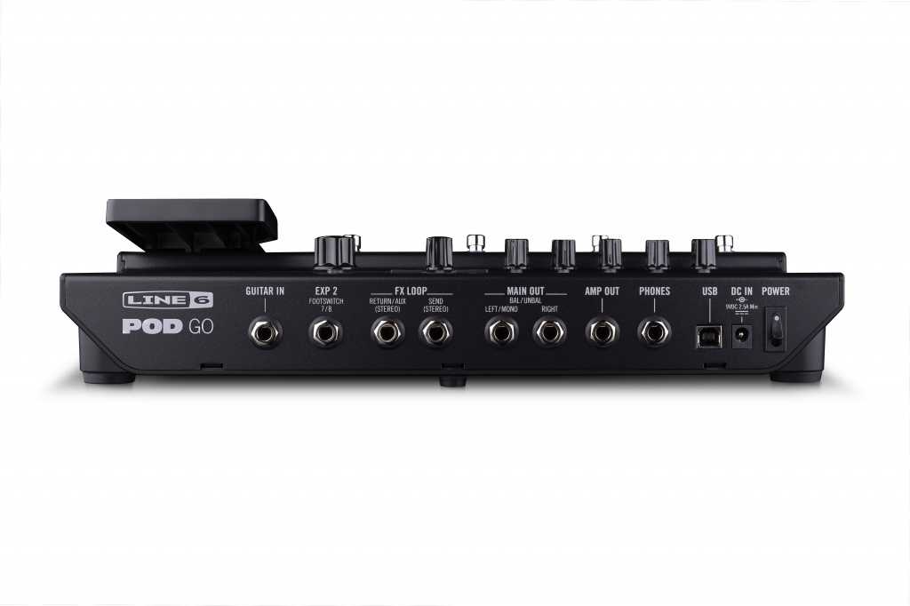 На задней панели расположены гитарный вход, педаль экспрессии 2/ножной переключатель 7/8, FX send и FX return (оба стерео), основной выход слева и справа, выход усилителя и гнезда для наушников (все 1/4 дюйма), а также полноразмерный USB-разъем для использования POD Go в качестве 24-битного цифрового аудиоинтерфейса 4×4 или управления и редактирования устройства с помощью бесплатного приложения POD Go Edit для компьютеров Mac и Windows.