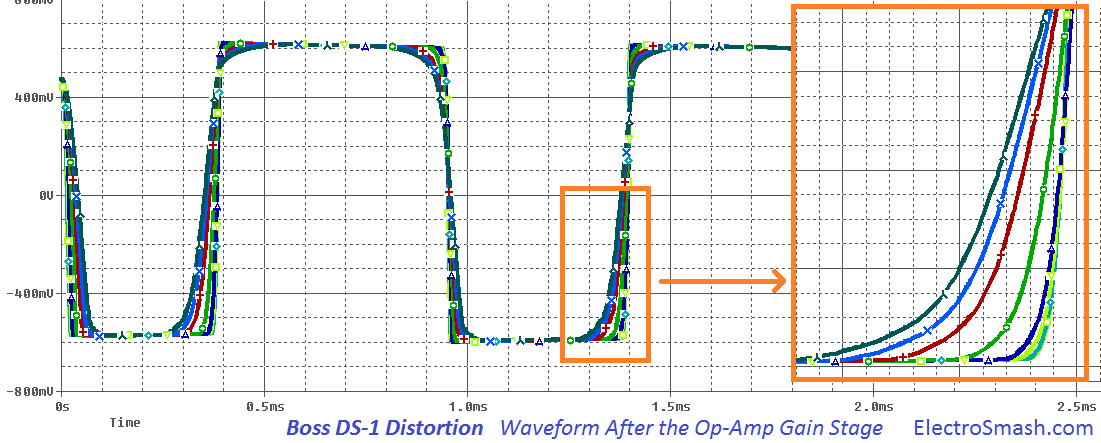 The clipping stage defines the distortion signature sound, it is built using 2 back to back diodes that shunt the signal to AC ground (4.5V), this kind of clipping technique gives a “hard-clipping” sound also used in the MXR Micro-amp or the RAT opposed to the “soft-clipping” style created by placing the diodes on the feedback loop of the op-amp and used in other pedals like the Tube-Screamer.