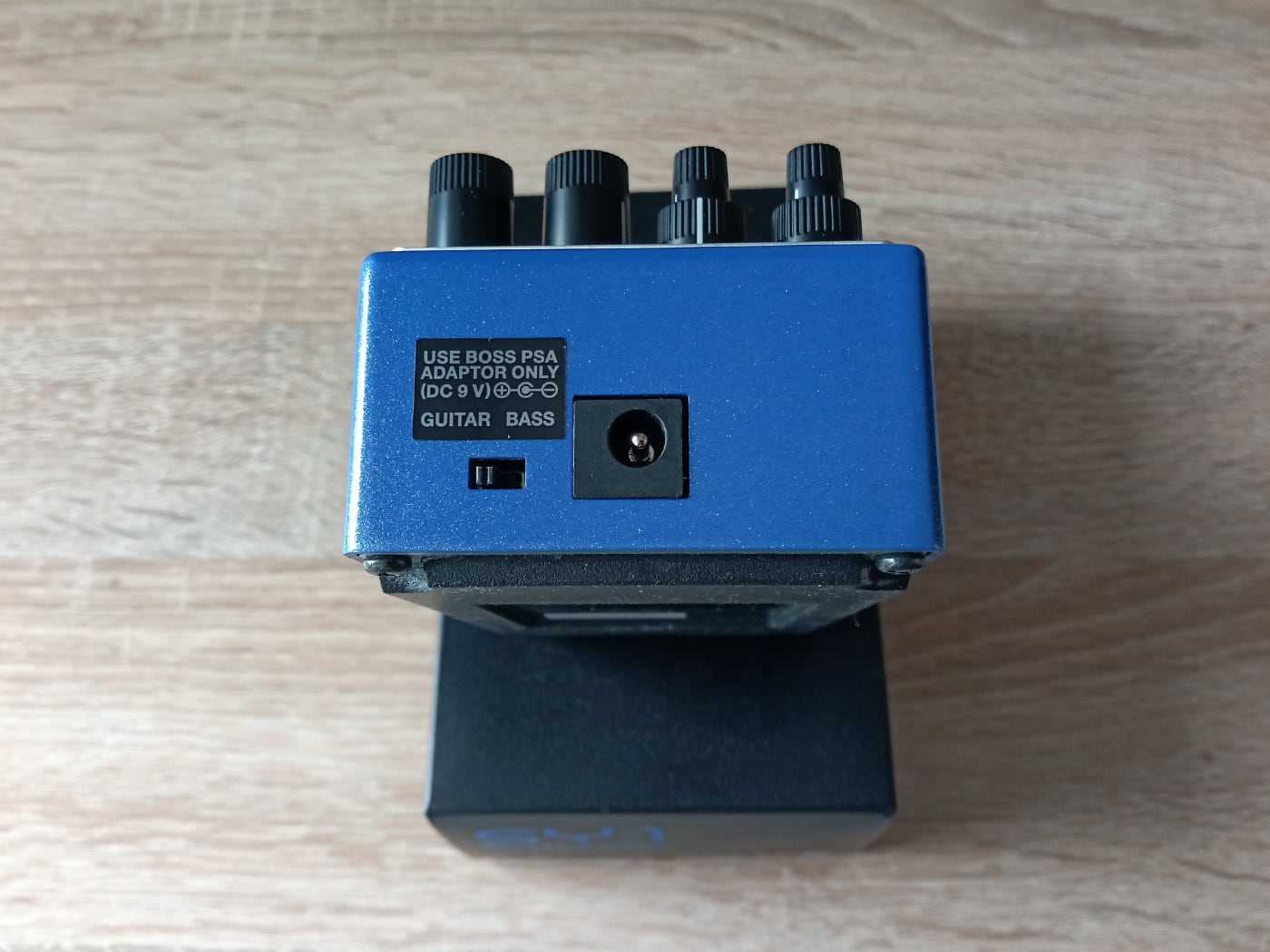 На верхнем торце вход для подключения блока питания и переключатель режима работы педали. В зависимости от используемого инструмента, электрогитары или баса, переключатель устанавливается в одно из положений.