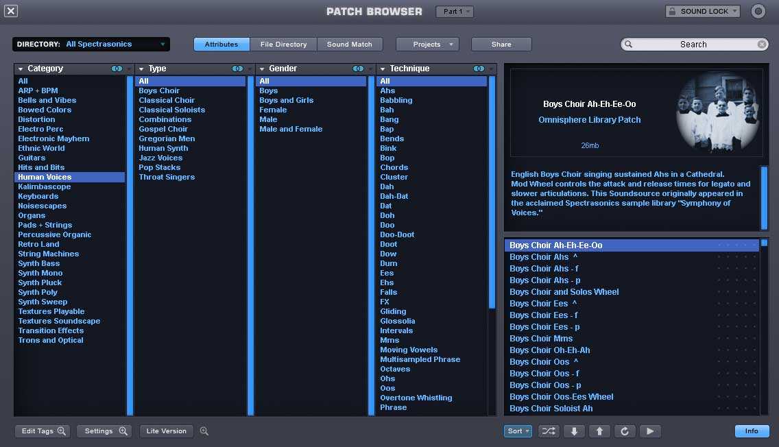 For instance, since Omnisphere 2 features the overwhelming majority of Spectrasonics back catalog, you’ll find most of the sounds from their 90s “Symphony of Voices” and “Vocal Planet” series, giving Omnisphere the widest variety of choral sounds that I’ve ever seen in a single product anywhere. The choirs do not have word building, legato sampling or in many cases even multiple dynamic layers (unlike modern offerings from Virharmonic, Strezov Sampling, Soundiron, 8Dio and many others) but many of these sounds simply have not been recorded with similar ensembles elsewhere. As such, I frequently layer Omnisphere choral sounds alongside dedicated choir libraries, especially the Omnisphere Japanese Children’s Choir. There’s a similar story for guitars, mandolins and electric sitar – with the sounds coming from Spectrasonics 90s library series “Hans Zimmers Guitars”. Omnisphere is not meant to compete with ethnic instrument collections like Quantum Leap Ra or Best Service Ethno World, though there are few such patches on offer, especially in regards to plucked strings (including some from the aforementioned guitar library).
