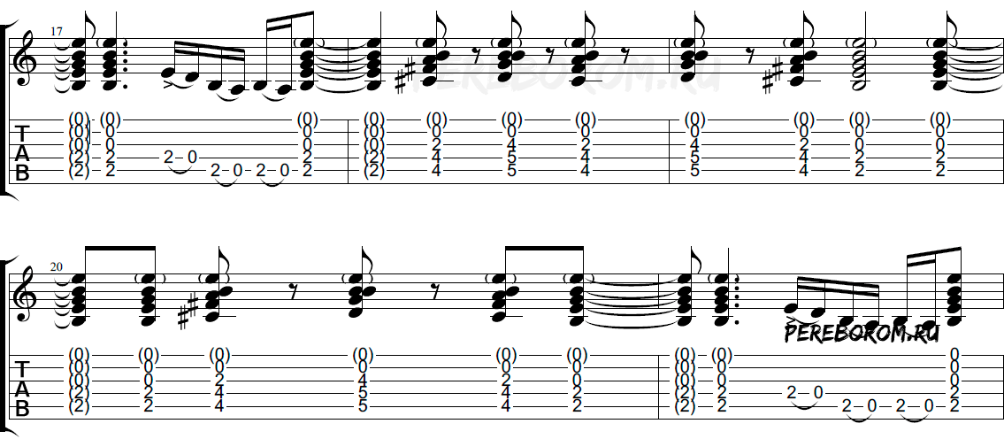 Такой тип исполнения можно считать еще одним частным случаев аккордовых рифов, только вместо боя или ударов медиатором используется перебор (арпеджио). Этот прием дает ощущение направленности музыки, делает ее подвижной и динамичной. Такие фрагменты часто используются в качестве полноценного аккомпанемента, как например, в песне I love you группы Nickelback. Табы вы найдете ниже.