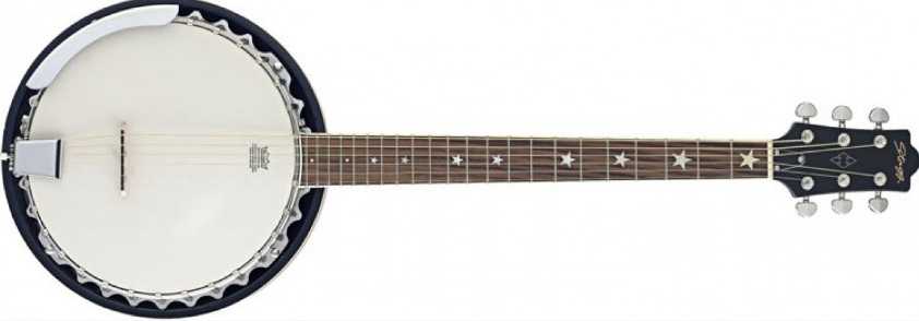 - Шестиструнный. Имеет дополнительную басовую струну между нижней и четвертой. Строй: G4-G2-D3-G3-B3-D4. Из-за количества струн этой модели игре на банджо могут легко учиться гитаристы, без переучивания пальцевой техники.