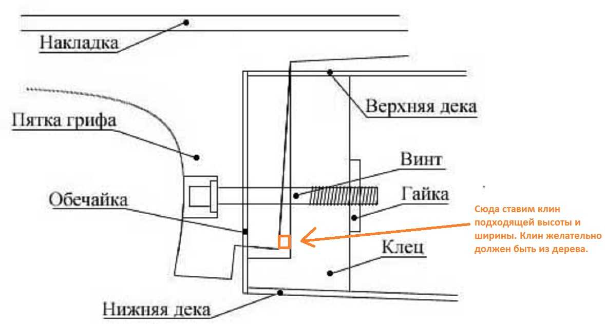 из дерева или другого подходящего материала. Клин нужен, что бы разместить его на внутренней части пятки грифа и закрутить гриф для неподвижного состояния, при этом сохранив оптимальное расстояние струн до грифа. Но устанавливая клин, придётся снимать гриф, соответственно и струны тоже.