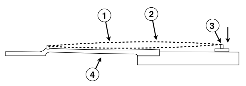 Это даст эффект в точке 1, но играть в высоком регистре будет очень неудобно (точка 2). Чтобы избавиться от этой проблемы нам нужно сделать в грифе небольшой прогиб (точка 4), который позволит беспрепятственно вибрировать струне (Ex. 5). Сделав так, мы сможем избавиться от дребезга, и опустить струны на бридже (точка 3), что даст нам равномерную высоту струны над грифом и добавит комфорта при игре.