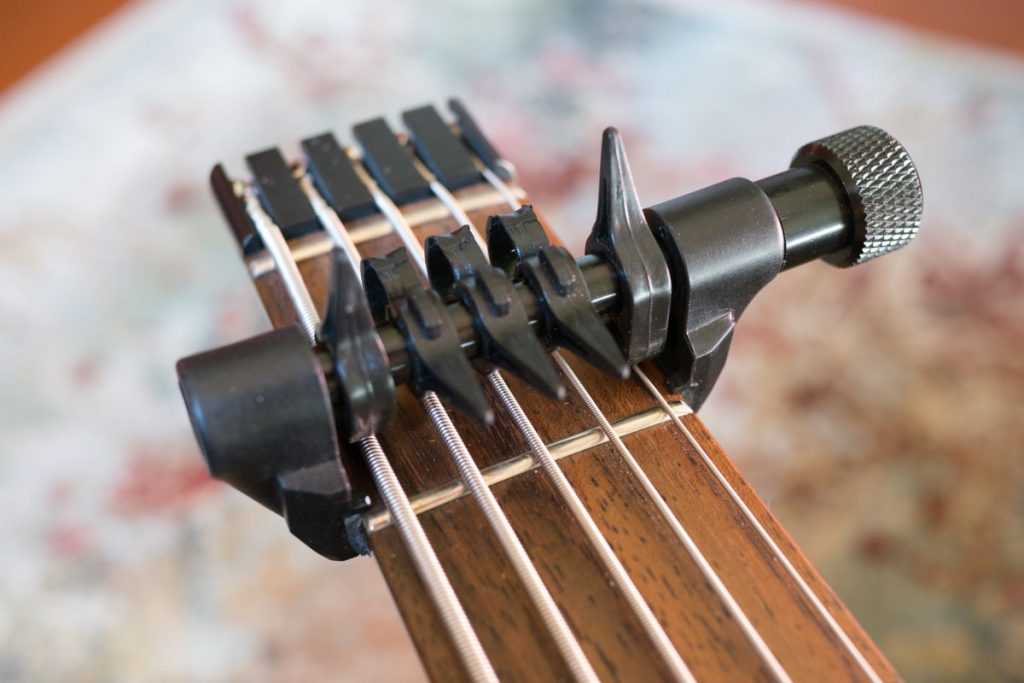 Чтобы измерить прогиб нам понадобится помощь другого человека или же можно использовать каподастр, чтобы прижимать струну на первом ладу. В моем арсенале имеется такой вот каподастр, с возможностью индивидуально прижимать каждую струну. Но, в данном случае это не принципиально.