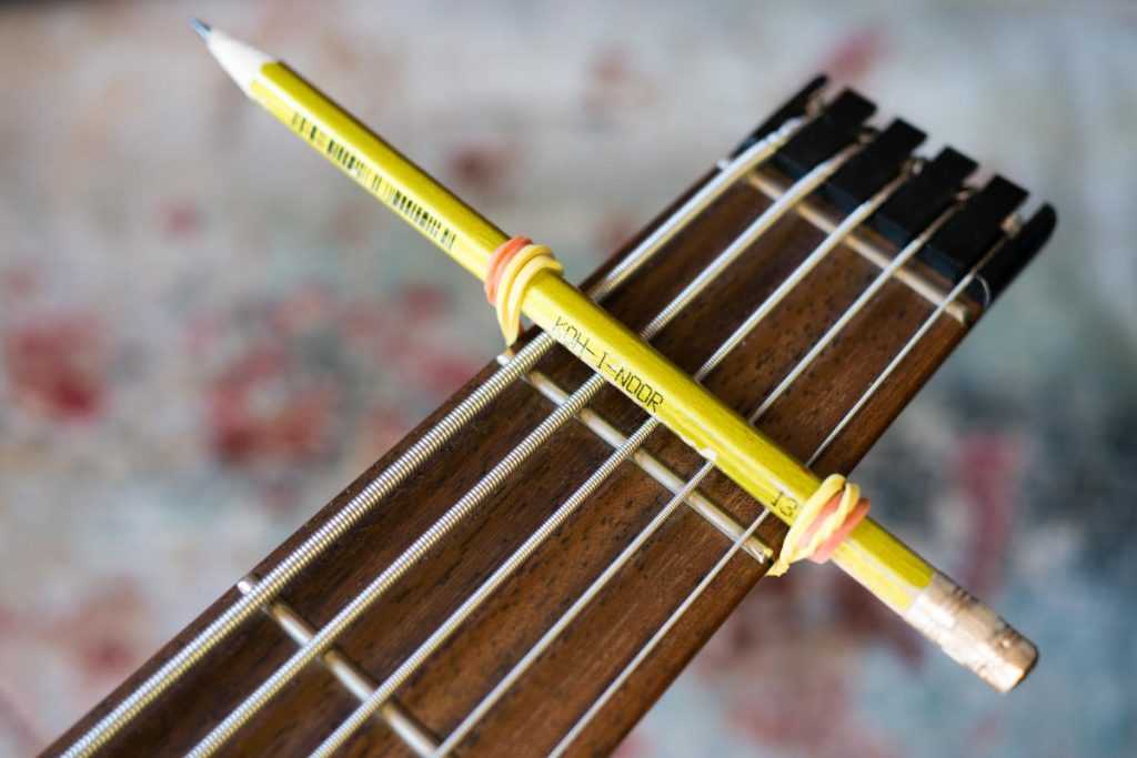 Если каподастра нет, можете попытаться сколхозить прижим из карандаша и резиночки, но в моей практике это не срабатывало. Вам просто не удастся создать резинкой нужное усилие для прижатия толстой струны.
