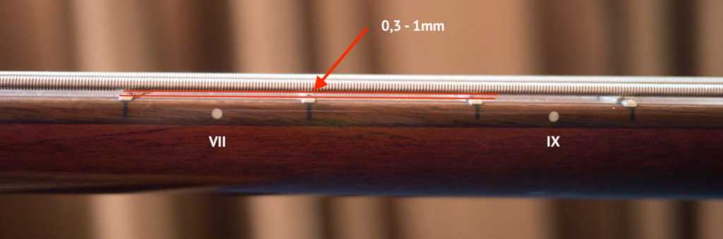 Зазор действительно очень маленький, поэтому, если вы не профессиональный гитарист, то можно и на глаз определить. Тут главное чтобы струна не лежала на ладе и не было между ними заметного зазора близкого к о,5 -1 мм.