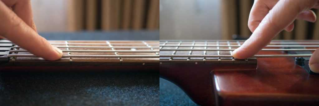 Прежде всего, на инструменте должны стоять новые струны и он должен быть настроен. Измерения нужно проводить сидя с инструментом, как будто вы собрались на нем играть. Прижмите указательным пальцем левой руки самую толстую струну (E или B или что там у вас) на первом ладу, а указательным пальцем правой руки на последнем ладу, как показано на фото (Ex. 3).