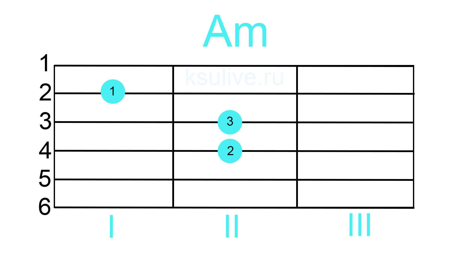 Если вы откроете любую аббревиатуру аккорда, то на интуитивном уровне что-то поймете. Посмотрите на схему ниже. Перед вами аккорд Am (ля минор).