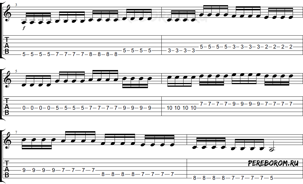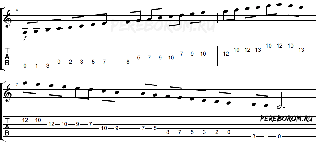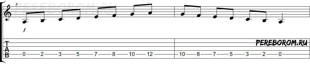 Следующее упражнение – сыграть гамму на всем грифе переменным штрихом, двигаясь по ладам. Начинайте с медленного для вас темпа, и постепенно наращивая скорость. Вам нужно как сыграть ее вперед, так и назад.