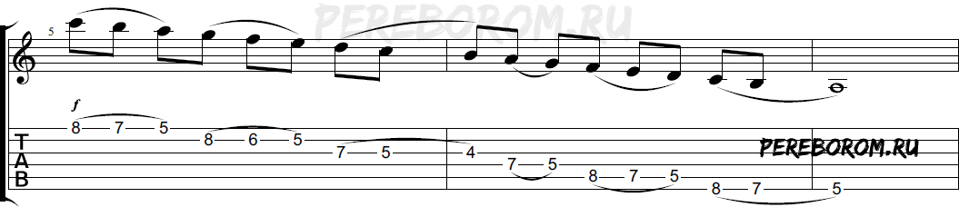 Теперь вам нужно сыграть гамму в обратную сторону, используя пул-офф. Удар медиатора точно так же должен быть только на первую ноту, все остальное играется пальцами. Вам может помочь взятие баррэ в некоторых позициях.