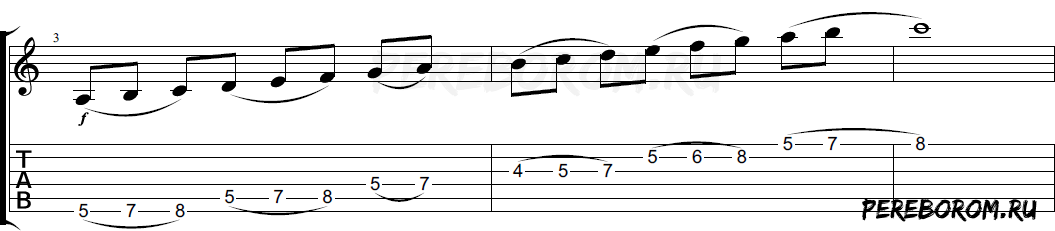 Первое упражнение – самое простое. Ваша задача – просто сыграть гамму на одной струне. Во второй половине это усложняется тем, что вам придется возвращаться к уже сыгранным ладам. Это – проверка на вашу координацию.