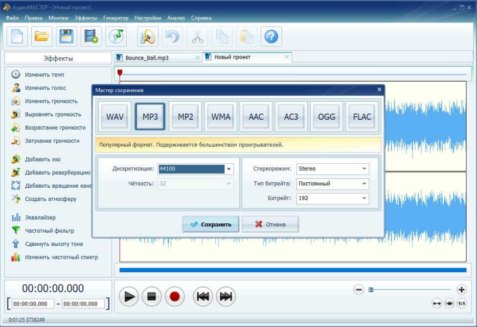 Найдите на верхней панели инструментов кнопку с изображением дискеты и нажмите её. Дождитесь, пока программа применит к аудиофайлу все изменения. После этого откройте пункт «Файл» в главном меню и выберите параметры экспорта. Вы можете настроить выходной формат, режим моно или стерео, изменить битрейт и частоту. Нажмите «Сохранить», выберите папку и название.