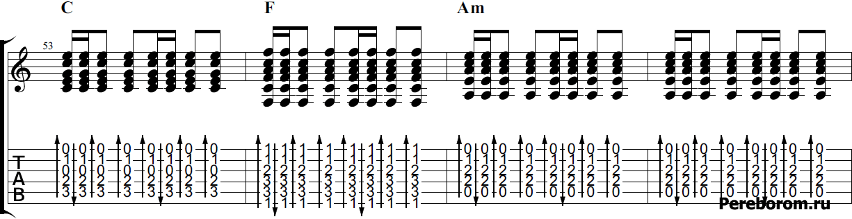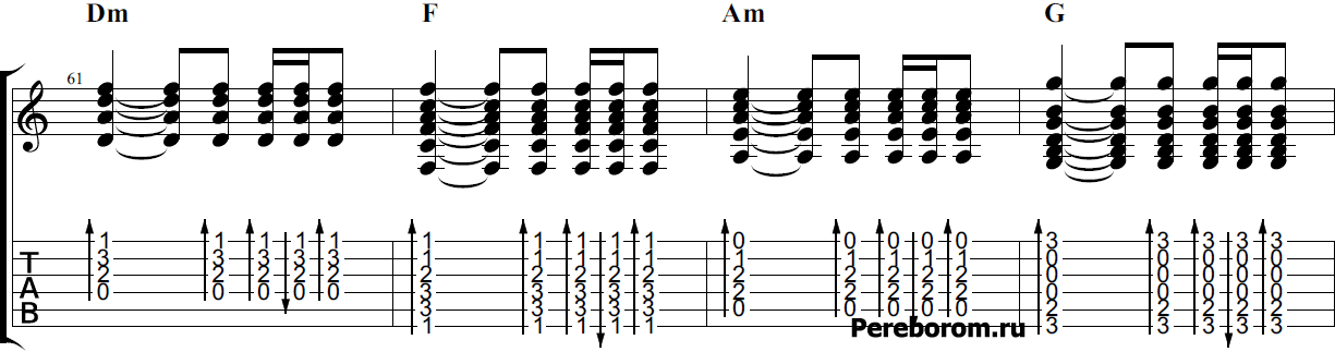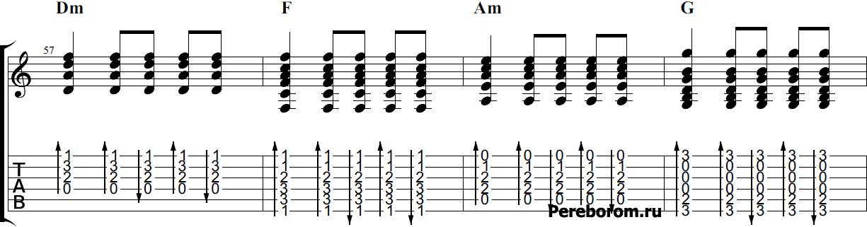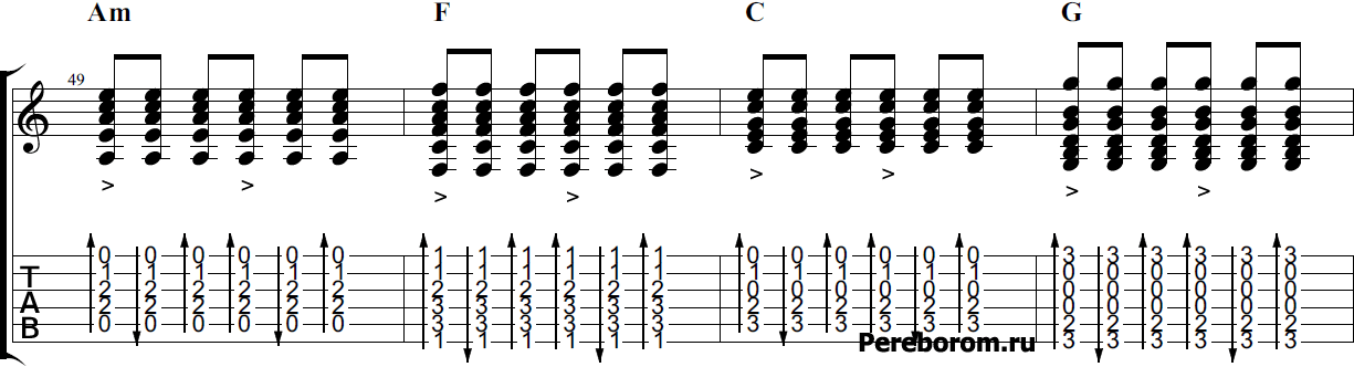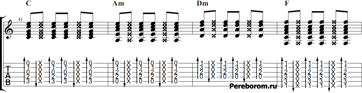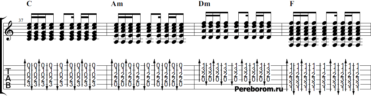 Самый простой штрих, который представляет собой просто чередование ударов «вниз – вверх», обычно два раза на один аккорд. Изучить четверку легче всего, однако зачастую она используется с глушением струн на третьем ударе. Этой схемой исполняется: «Пачка сигарет» Виктора Цоя.