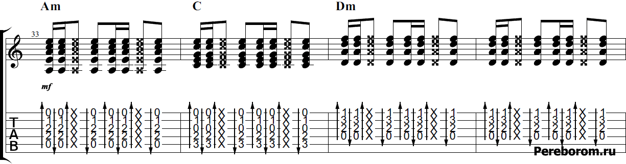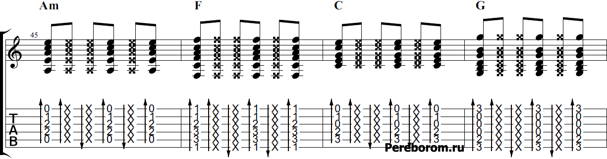 Тут без указания аккордов, а крестиками помечена последовательность игры. Иногда такой перебор называют «блатным», он используется в русском шансоне.