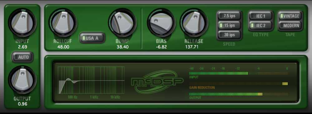 Turning now to the AC202, with this plugin you will find all the features you might expect from a tape machine. These include playback speed, equalization, and bias. McDSP goes a bit further in giving you additional features you might not expect like an independent head bump and low frequency roll off. Also included are several head types, tape saturation recovery times, and tape formulations.