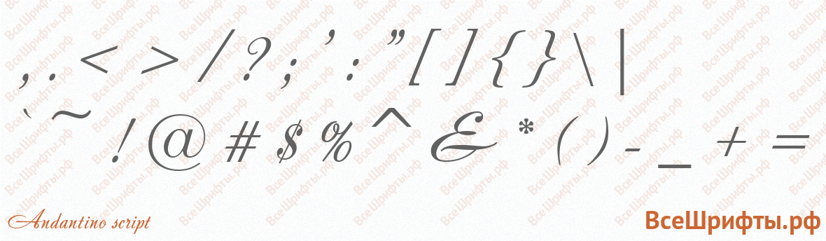 Предварительный просмотр шрифта «Andantino script» со знаками препинания и пунктуации (, . / ? ; ‘ : » { } \ | ` ~ ! @ # $ % ^ & * ( ) — _ + =).