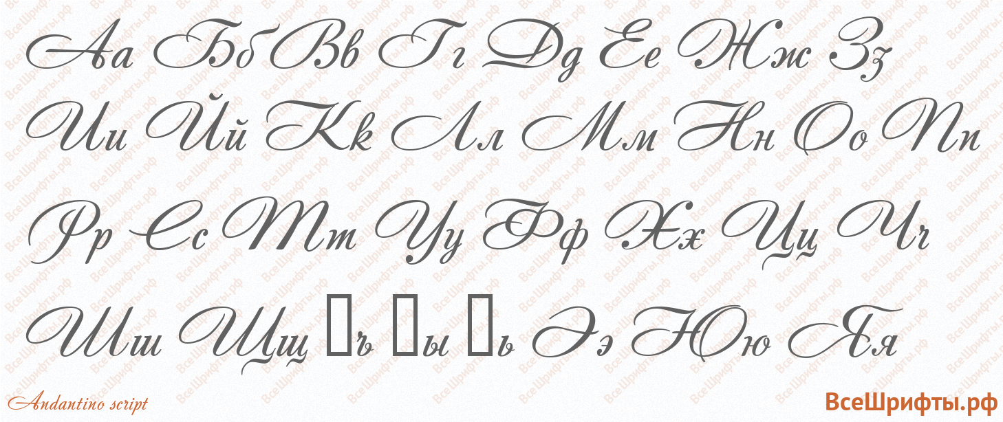 Предварительный просмотр шрифта «Andantino script» с прописными и строчными русскими буквами (кириллица, русский алфавит А-Я и а-я).