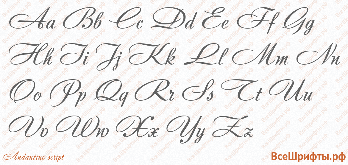 Предварительный просмотр шрифта «Andantino script» с прописными и строчными латинскими буквами (английский алфавит A-Z и a-z).