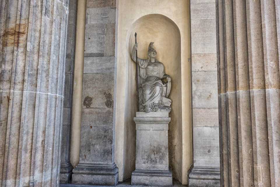 Примечательно, что мраморная квадрига запряжена не привычными лошадьми, а львами – они символизируют дом Виттельсбахов (Wittelsbach). Управляет колесницей бронзовая фигура Баварии.