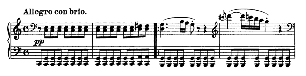 It then swiftly ascends, followed by a three-note descent in the middle register and a four-note descent in the upper. This phrase is then repeated starting on B♭ major – a whole tone lower – a device Beethoven also used for the opening of the Sonata No. 16 in G Major (Op. 31 No. 1). After a half cadence to the dominant (G major), the opening phrase returns again but this time in a tremolo variation.