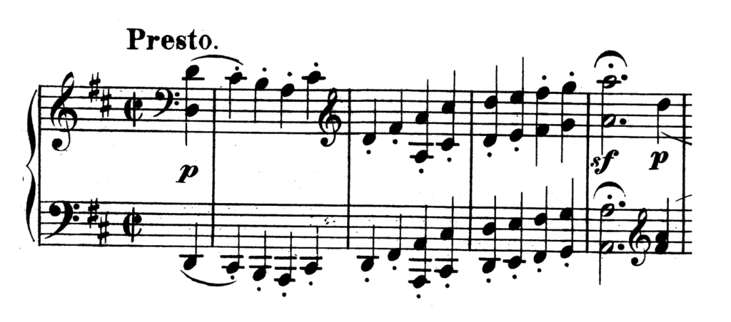Bars 65-End: Coda. The Coda is entirely altered, the first two bars of the first subject appear in the bass, accompanied by a semiquaver (sixteenth note) figure in the treble, after which the bass rises chromatically from A natural to the octave above (omitting F sharp). The harmony abounds in chords of the diminished seventh. A pedal point on A (the dominant) and some slight reminiscences of the first subject brings the Coda to a close.