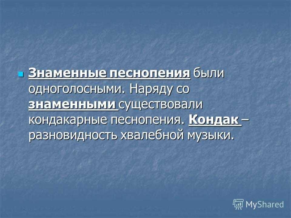 Знаменные песнопения были одноголосными. Наряду со знаменными существовали кондакарные песнопения. Кондак – разновидность хвалебной музыки. Знаменные песнопения были одноголосными. Наряду со знаменными существовали кондакарные песнопения. Кондак – разновидность хвалебной музыки.