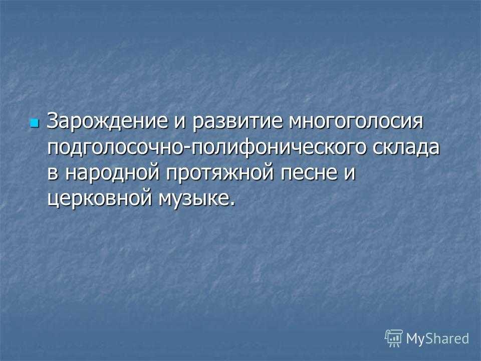 Зарождение и развитие многоголосия подголосочно-полифонического склада в народной протяжной песне и церковной музыке. Зарождение и развитие многоголосия подголосочно-полифонического склада в народной протяжной песне и церковной музыке.