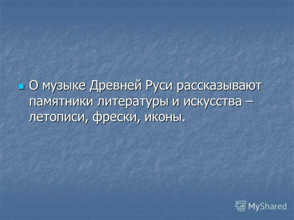 О музыке Древней Руси рассказывают памятники литературы и искусства – летописи, фрески, иконы. О музыке Древней Руси рассказывают памятники литературы и искусства – летописи, фрески, иконы.