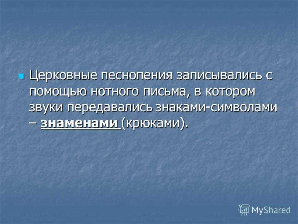 Церковные песнопения записывались с помощью нотного письма, в котором звуки передавались знаками-символами – знаменами (крюками). Церковные песнопения записывались с помощью нотного письма, в котором звуки передавались знаками-символами – знаменами (крюками).