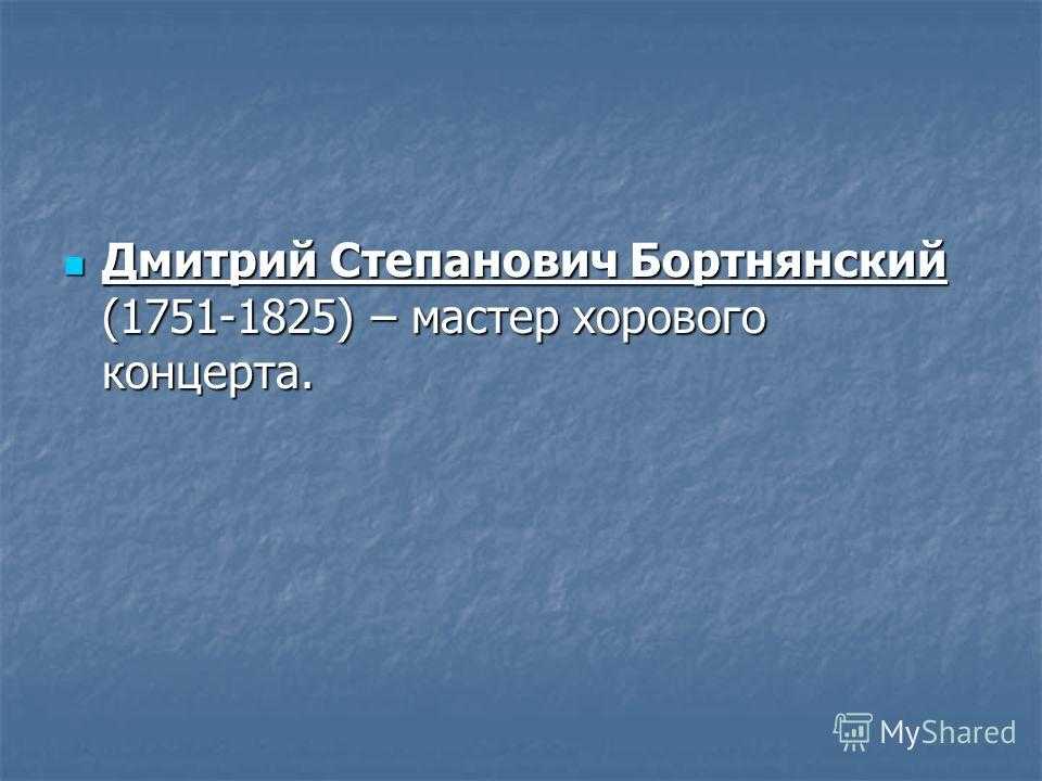 Дмитрий Степанович Бортнянский ( ) – мастер хорового концерта. Дмитрий Степанович Бортнянский ( ) – мастер хорового концерта.