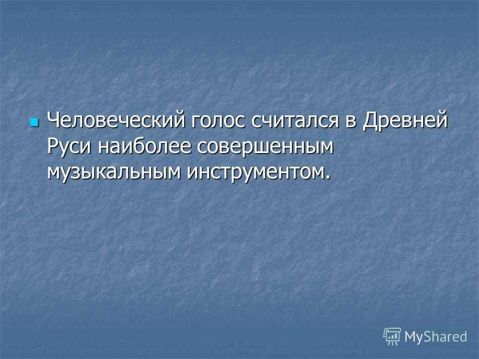 Человеческий голос считался в Древней Руси наиболее совершенным музыкальным инструментом. Человеческий голос считался в Древней Руси наиболее совершенным музыкальным инструментом.