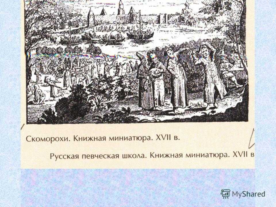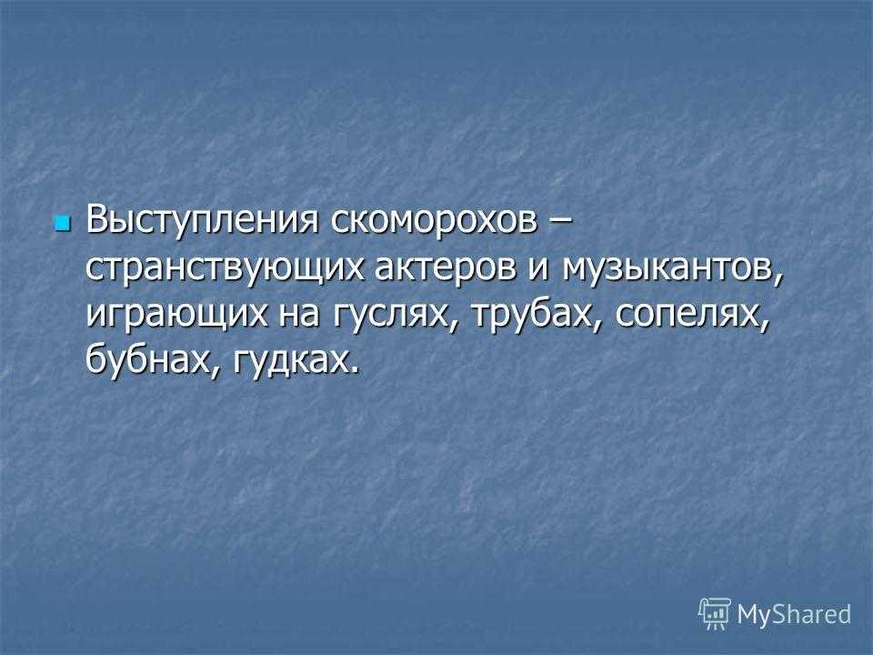 Выступления скоморохов – странствующих актеров и музыкантов, играющих на гуслях, трубах, сопелях, бубнах, гудках. Выступления скоморохов – странствующих актеров и музыкантов, играющих на гуслях, трубах, сопелях, бубнах, гудках.
