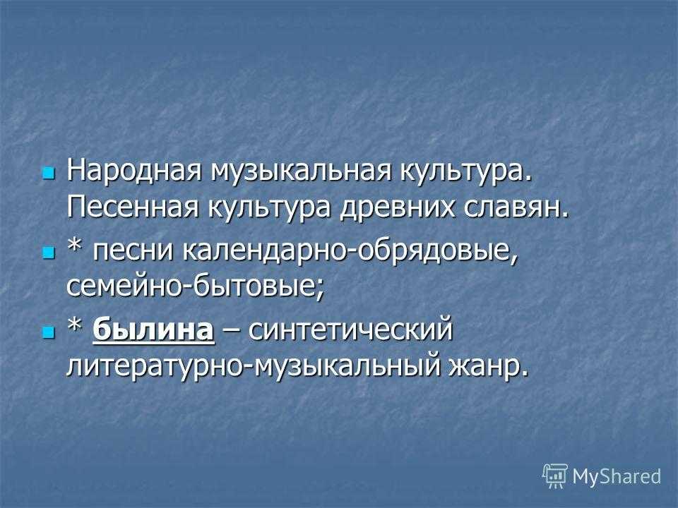 Народная музыкальная культура. Песенная культура древних славян. Народная музыкальная культура. Песенная культура древних славян. * песни календарно-обрядовые, семейно-бытовые; * песни календарно-обрядовые, семейно-бытовые; * былина – синтетический литературно-музыкальный жанр. * былина – синтетический литературно-музыкальный жанр.