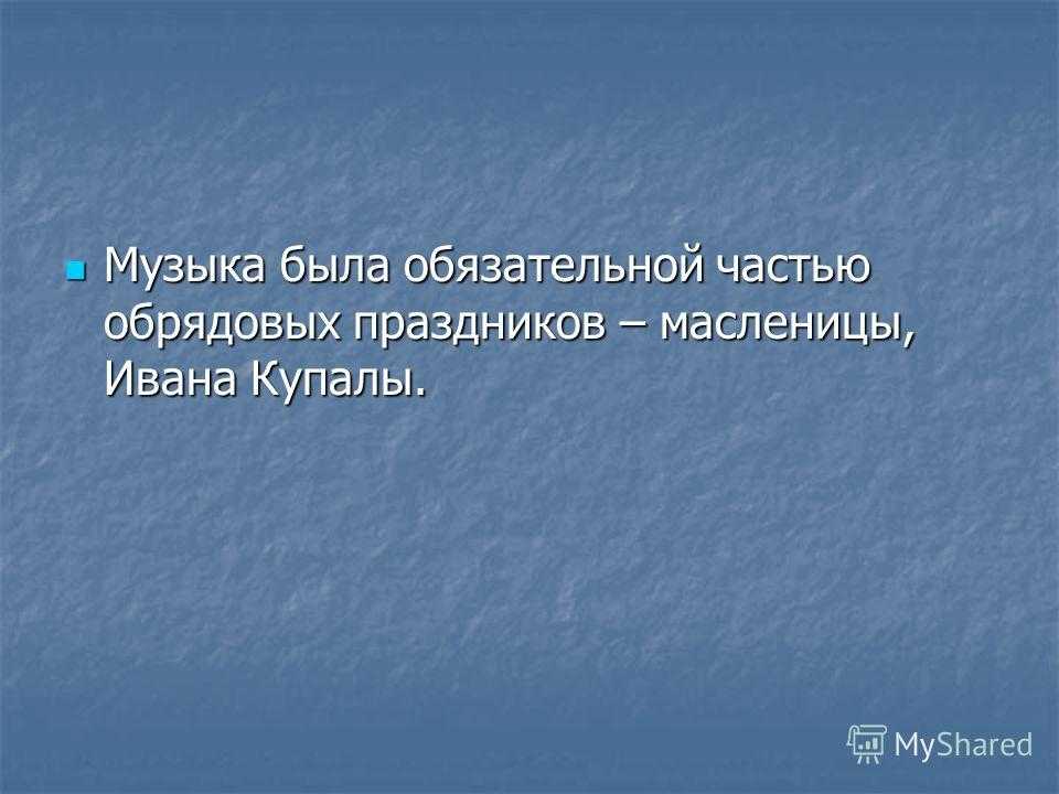 Музыка была обязательной частью обрядовых праздников – масленицы, Ивана Купалы. Музыка была обязательной частью обрядовых праздников – масленицы, Ивана Купалы.