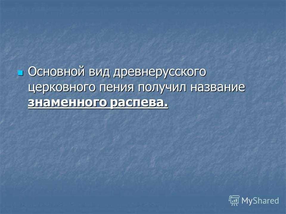 Основной вид древнерусского церковного пения получил название знаменного распева. Основной вид древнерусского церковного пения получил название знаменного распева.