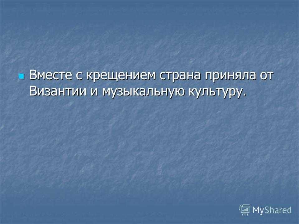Вместе с крещением страна приняла от Византии и музыкальную культуру. Вместе с крещением страна приняла от Византии и музыкальную культуру.